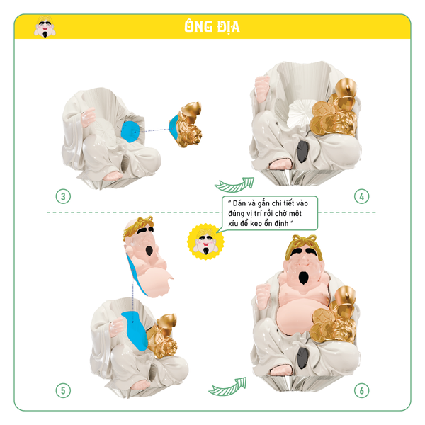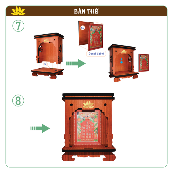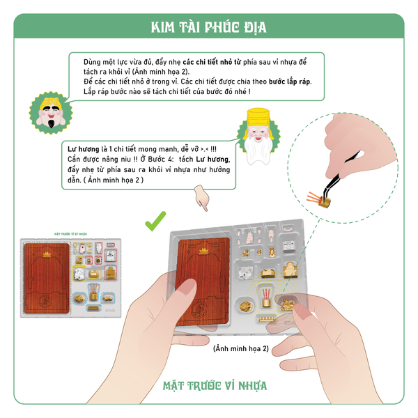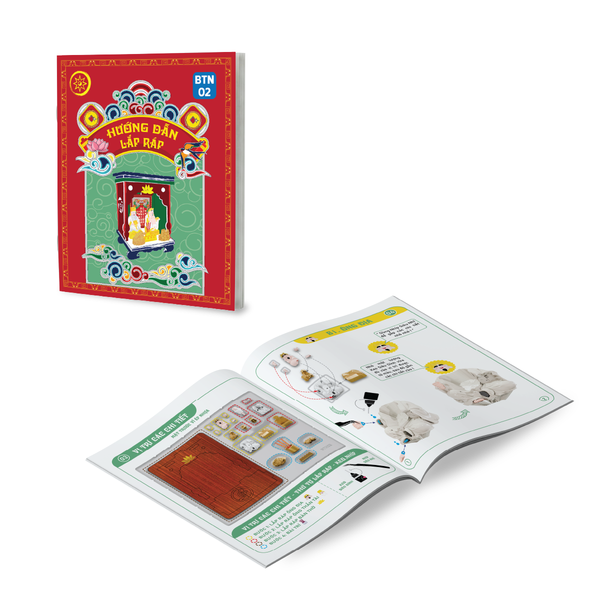 BTN-02: Sách hướng dẫn tiếng Việt, 04 tấm gỗ chứa 12 chi tiết lắp ráp thành 1 bàn thờ, 8 chi tiết nhựa Ông Địa, 6 chi tiết nhựa Thần Tài, 1 tượng Thiềm Thừ, 1 tượng Kì Lân, 1 lư hương, 1 bộ 5 chung nước + 1 cây nhíp gắp và hộp đựng bảo vệ.